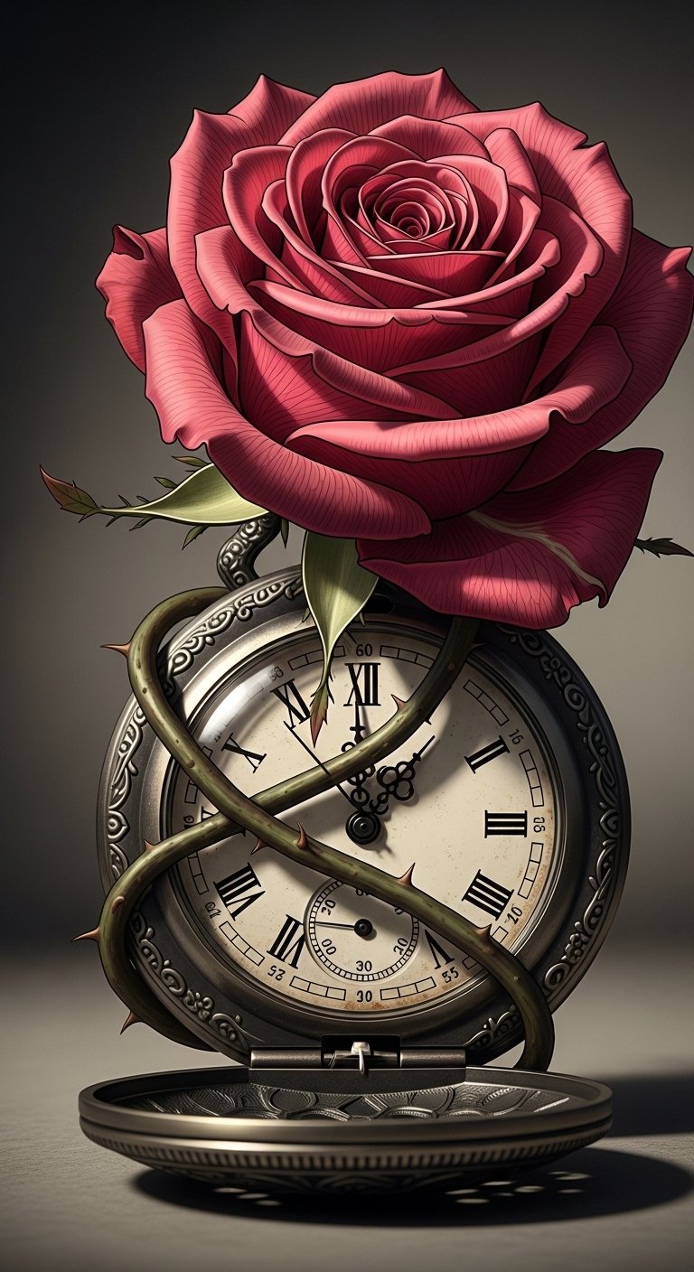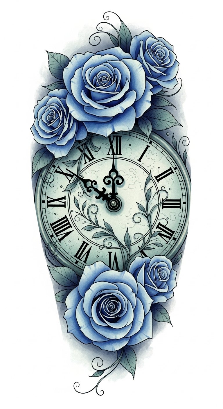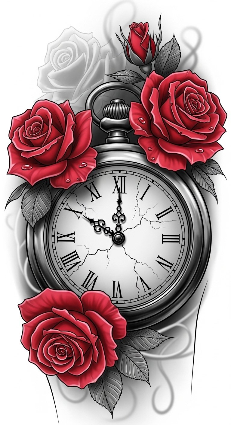 This design beautifully intertwines clock symbolism—representing the fleeting nature of time—with the passionate meanings of roses, symbolizing love and beauty.
