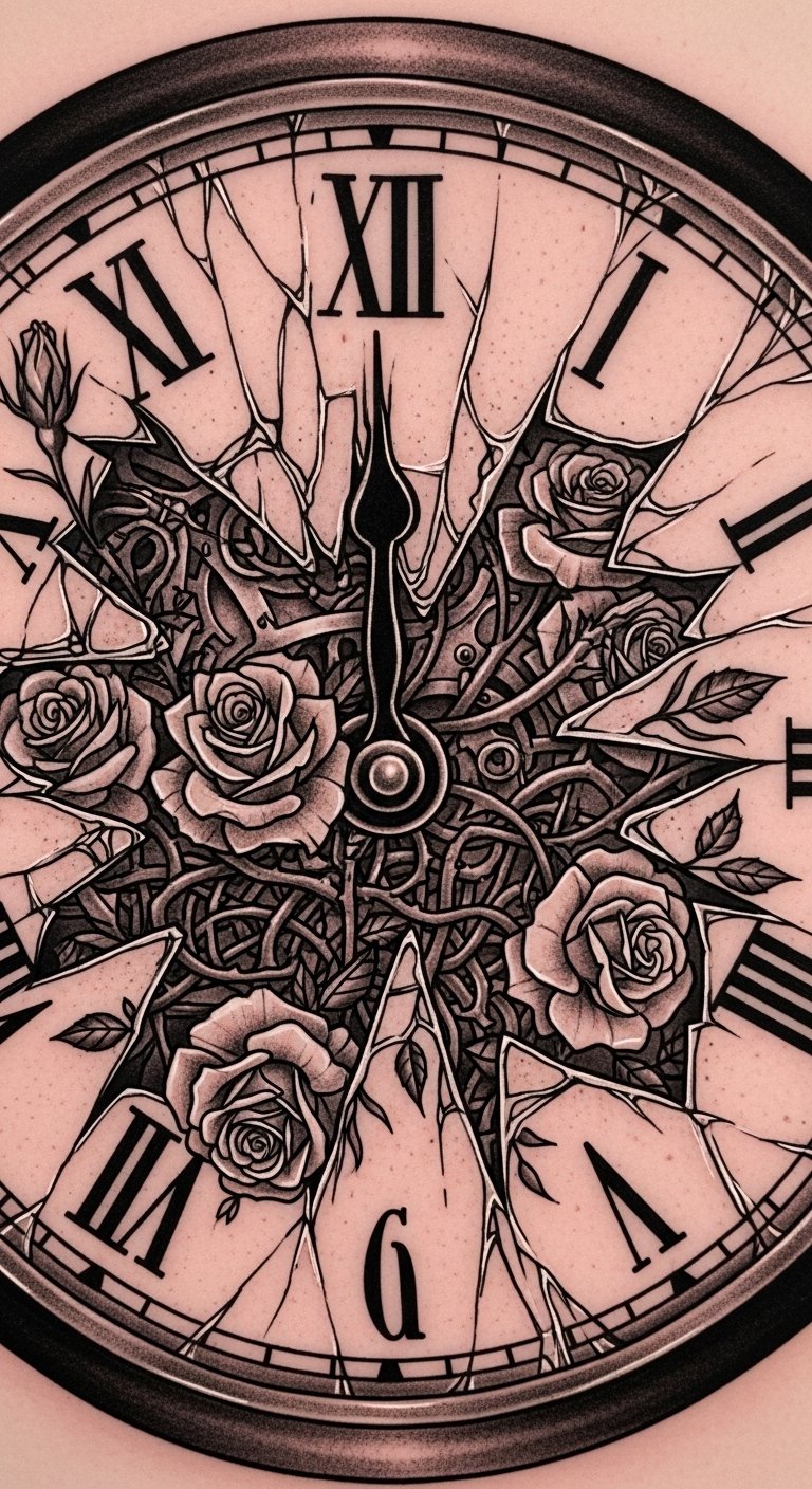 Delicate yet visceral, this design merges mechanical ruin with organic renewal: jagged clock fragments nestle around soft, layered rose petals and curling vines, with minute hands frozen mid-motion to suggest halted time.