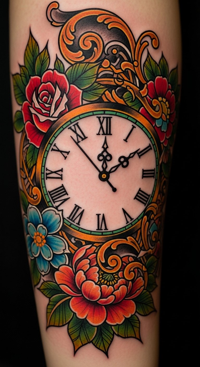 Neo-Traditional Clock With Vibrant Flowers
