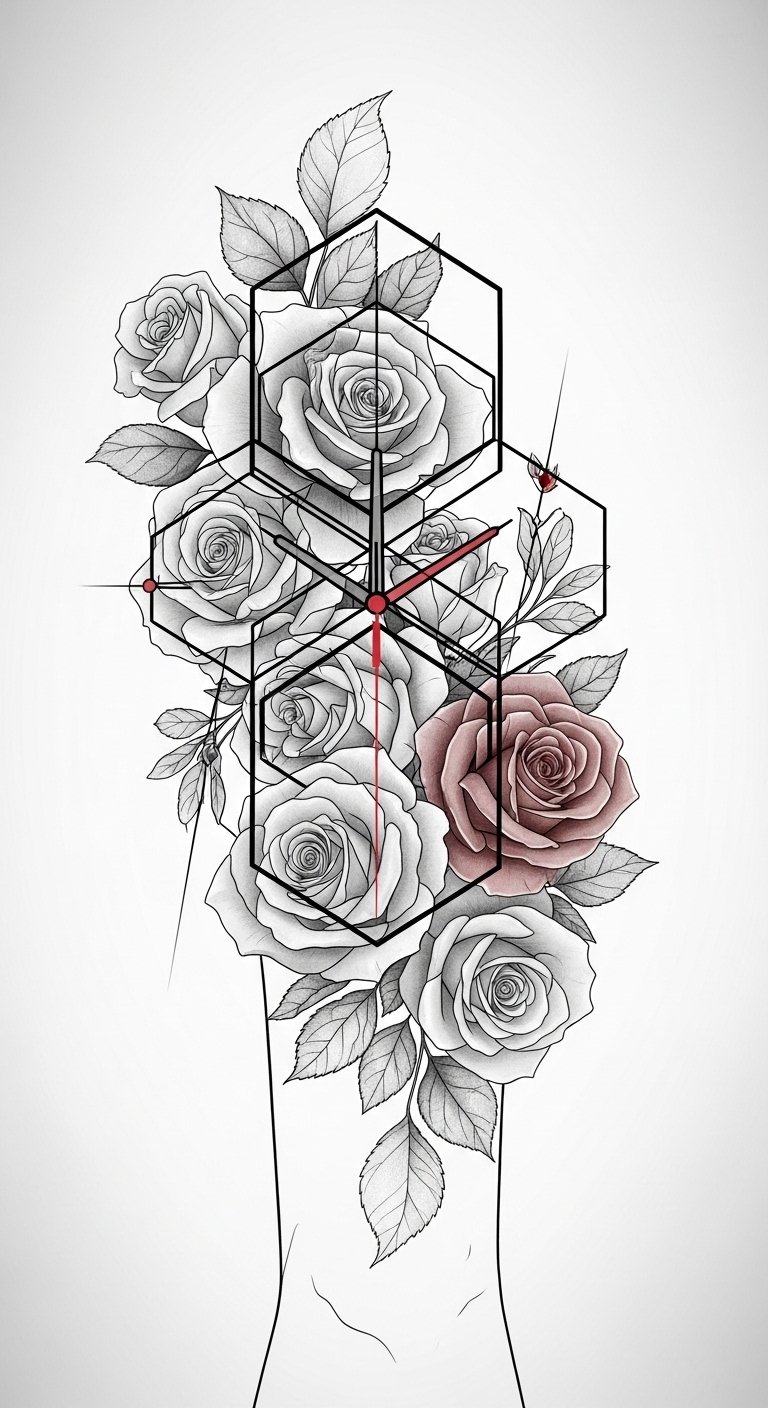 The contrast of monochrome timepiece and vivid roses evokes bittersweet sentiment—acceptance, remembrance, and celebration—making it ideal for forearm, chest, or rib placement where the composition can flow with muscle lines and be shown or concealed as desired.