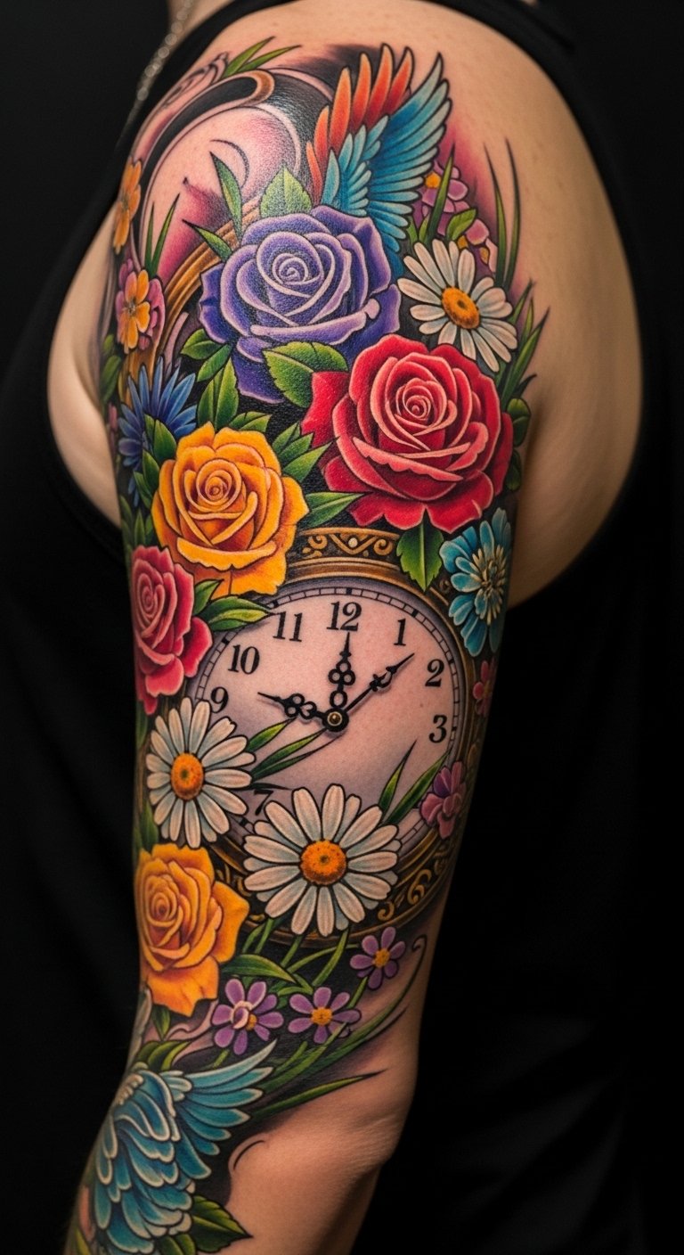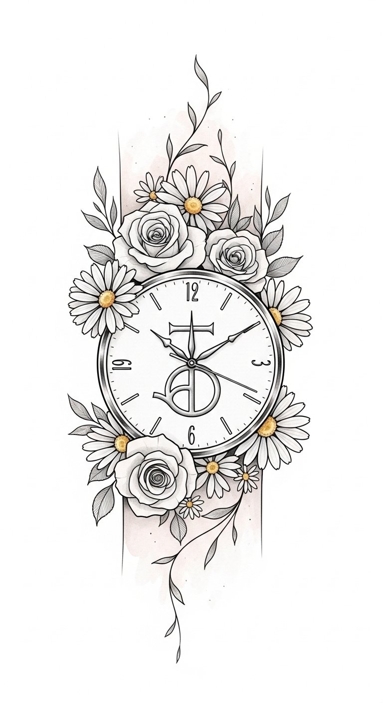 This design weaves time and nature into a symbolic composition: a vintage clock face partly overgrown by roses and daisies, petals and vines flowing outward in bright, saturated colors to suggest moments unfolding; roses signify love and passion while daisies reflect innocence and renewal, and the clock represents mortality and the preciousness of each moment—placed on the arm for visibility and daily reminder or on the back as a larger canvas for the piece to breathe, evoking freedom, personal growth, and the emotional journey of self-expression.