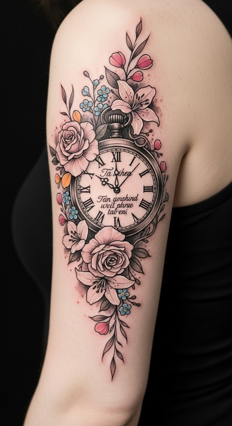 Custom floral clock tribute tattoos offer a unique way to honor cherished memories or loved ones, blending personal significance with artistic expression.