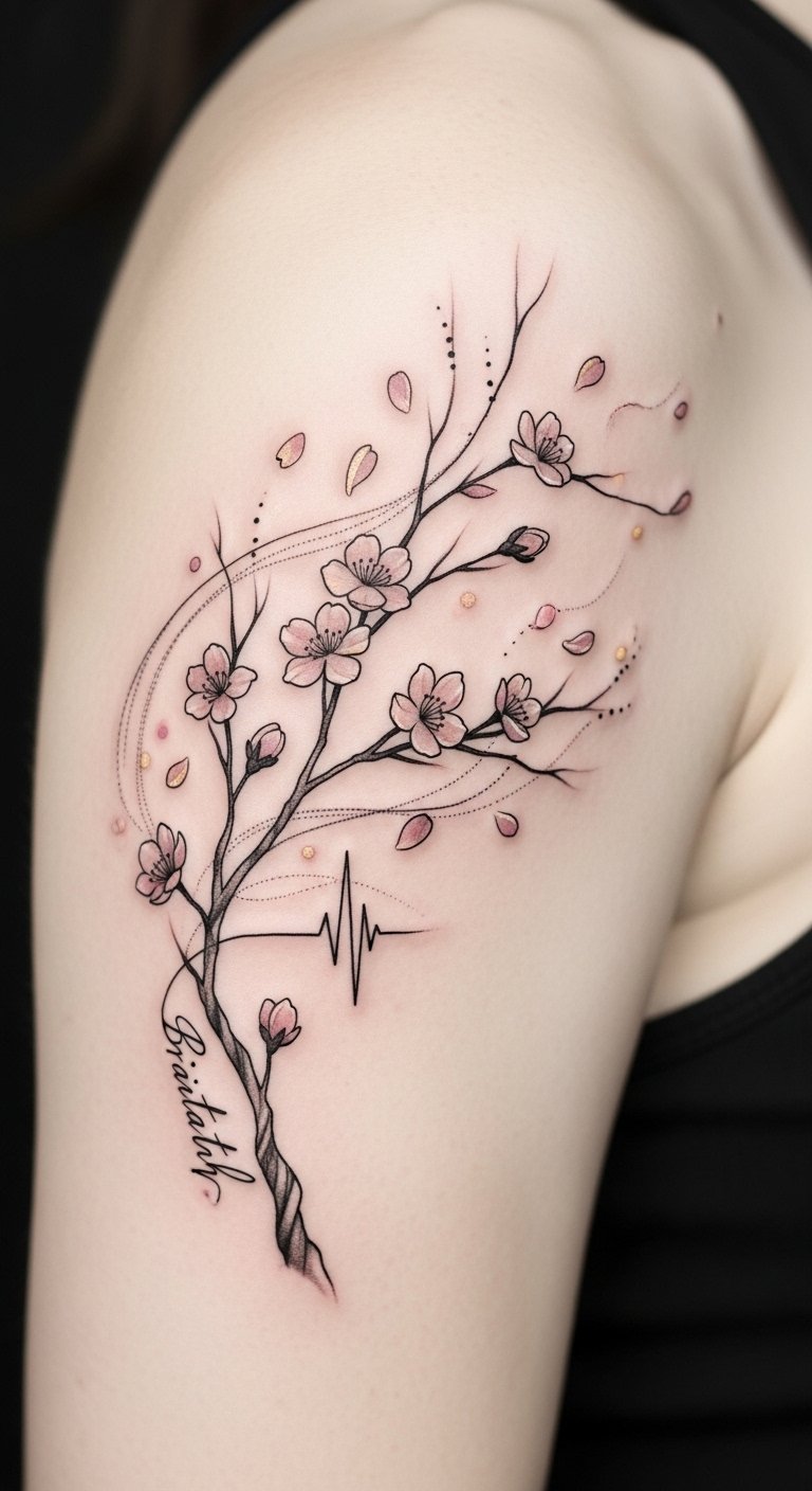 This design channels those emotions through gentle movement and soft color—symbolizing acceptance, renewal, and mindfulness—best placed where the flow of the body complements the branch (collarbone for subtle visibility, forearm for a visible daily reminder, ribcage for a private, intimate statement).