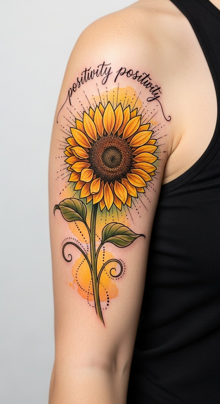 Imagine a tattoo adorned with a vibrant sunflower and an inspiring positivity quote, reminding you to chase dreams and spread happiness. These bold blooms serve as daily reminders of your inner light and the beauty of life.
