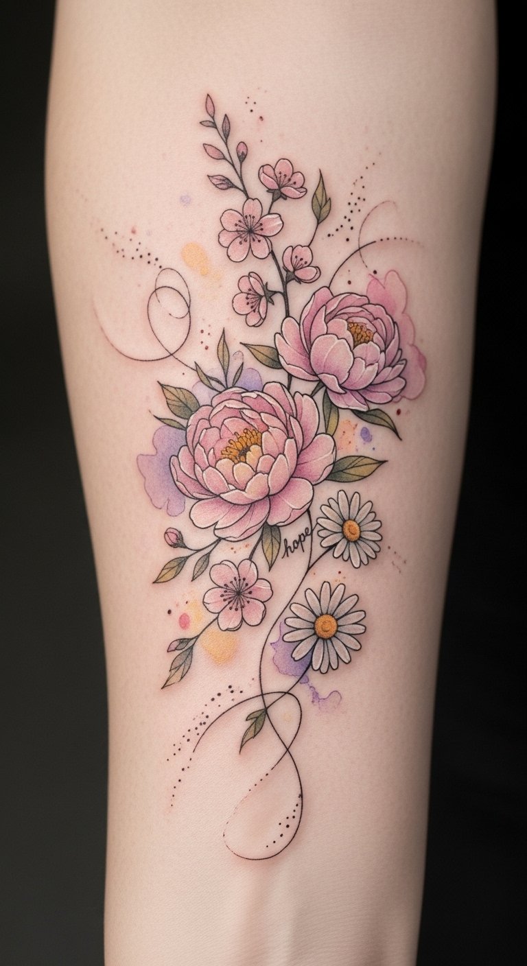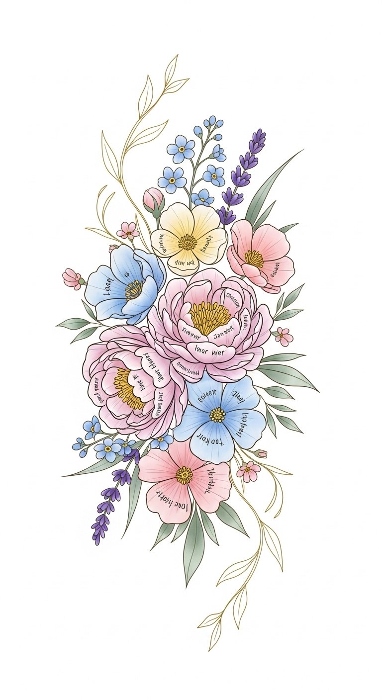 This design concept pairs gentle, flowing florals with micro-affirmation text on individual petals to evoke comfort, resilience, and daily encouragement; peonies and roses symbolize self-worth and love, forget-me-nots memory and constancy, lavender calm and healing, while gold linework adds a sense of inner light. Emotionally the piece is intimate and empowering, intended to be a personal talisman that reads differently up close and from a distance. Ideal placements include the inner forearm or ribs for privacy and frequent viewing, the shoulder blade for a larger composition, or along the collarbone to subtly illuminate posture and presence.