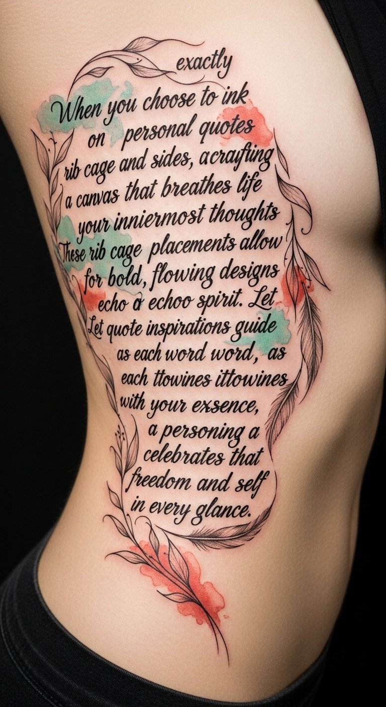 These rib cage placements allow for bold, flowing designs that echo your spirit. Let quote inspirations guide you, as each word intertwines with your essence, creating a personal tapestry that celebrates freedom and self-expression in every glance.