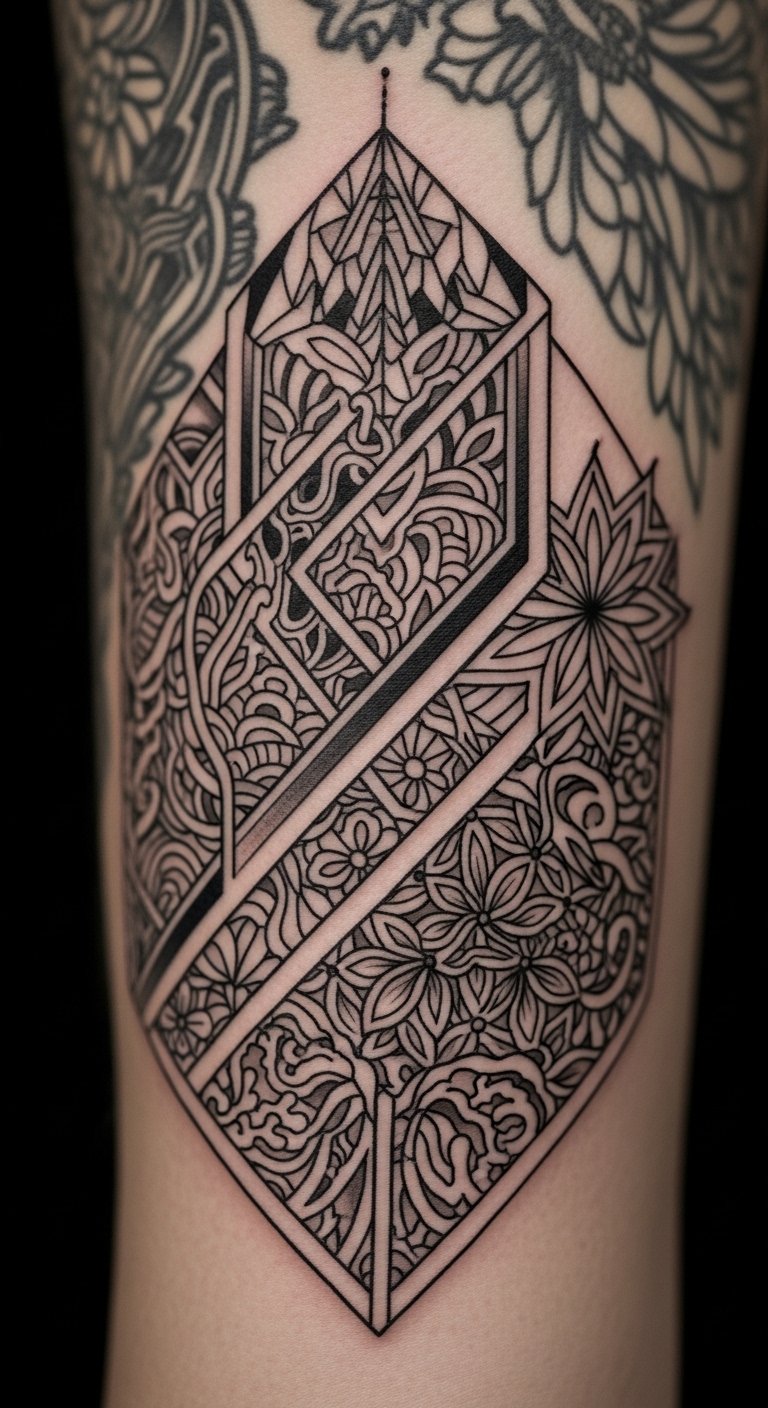 This design concept pairs interlocking geometric shapes—sharp triangles and concentric circles rendered in bold black lines—with a flowing illustrative centerpiece: a stylized phoenix rising through the geometry, its feathers detailed with fine dotwork and subtle color washes of crimson and amber. Symbolically this merges structure (geometry) and spirit (phoenix), expressing rebirth, balance, and self-expression. Emotionally it evokes empowerment and calm clarity. Ideal placement: upper back or chest where the composition can span horizontally and the central phoenix aligns with the spine or sternum for visual and symbolic grounding.