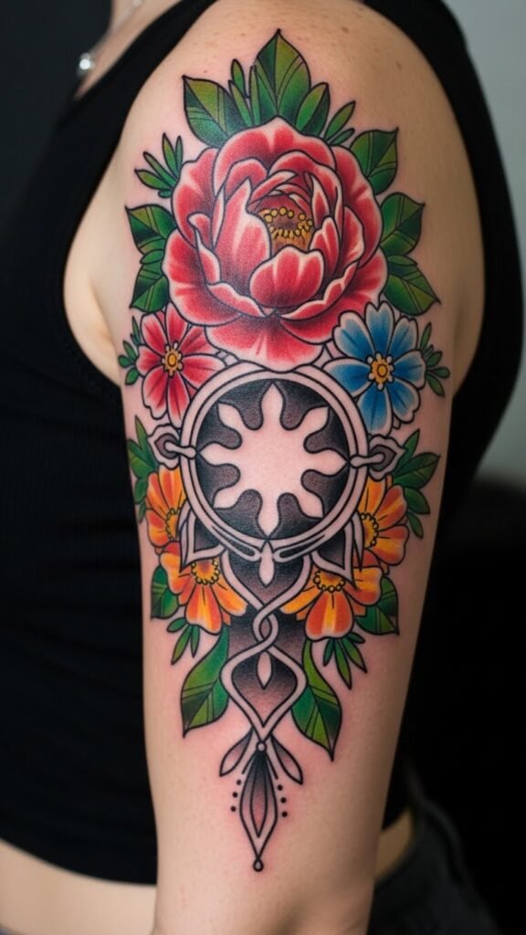 The design’s lush blooms and flowing leaves evoke resilience and renewal, while the bold palette and decisive outlines convey strength and presence—ideal for an upper arm or thigh wrap where movement enhances the composition and personal visibility amplifies the emotional statement.