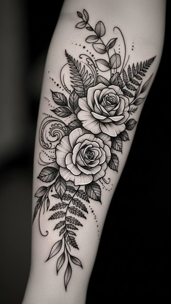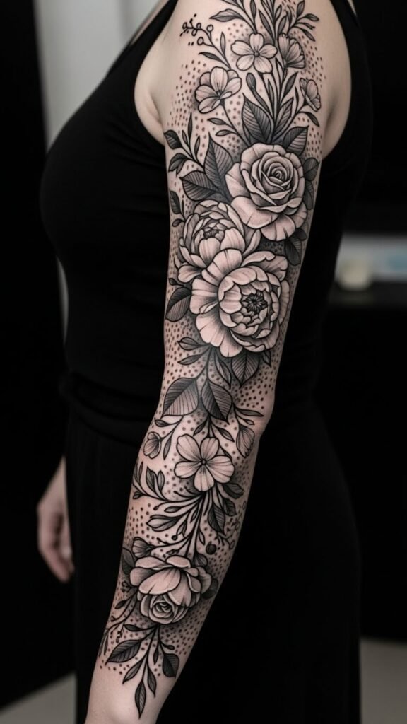 Building on the elegance of black-and-grey botanical pieces, floral sleeve tattoos elevate that beauty into a breathtaking, flowing masterpiece that wraps around your arm like a tapestry of nature.
