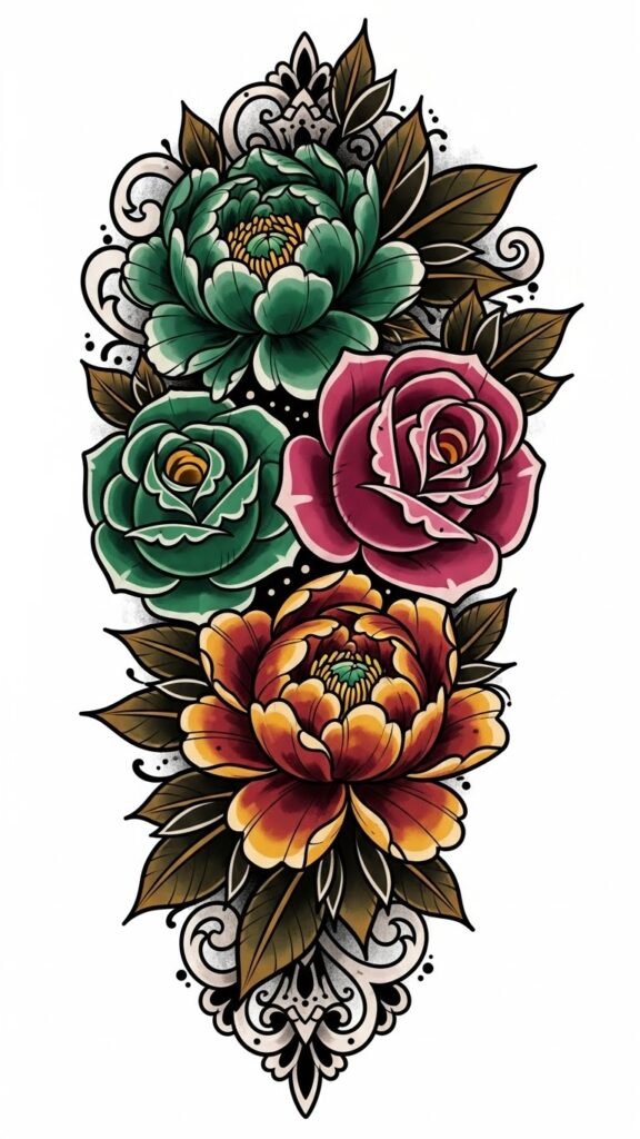 Symbolically, the composition celebrates passion, growth, and personal freedom—each flower type represents facets of the wearer’s character (resilience in buds, exuberance in full blooms, quiet strength in leaves)—while emotionally the piece reads as proud, joyful, and unapologetically expressive; ideal placement areas include the shoulder, upper chest, forearm, or thigh where movement and body contours enhance the sense of a living garden.