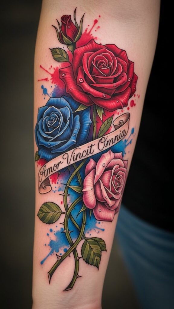 The intertwined roses represent layered emotions—romance (red), mystery or longing (blue), and growth or tenderness (pink); dewdrops add vulnerability, thorns hint at protection, and the banner can hold a name or date.