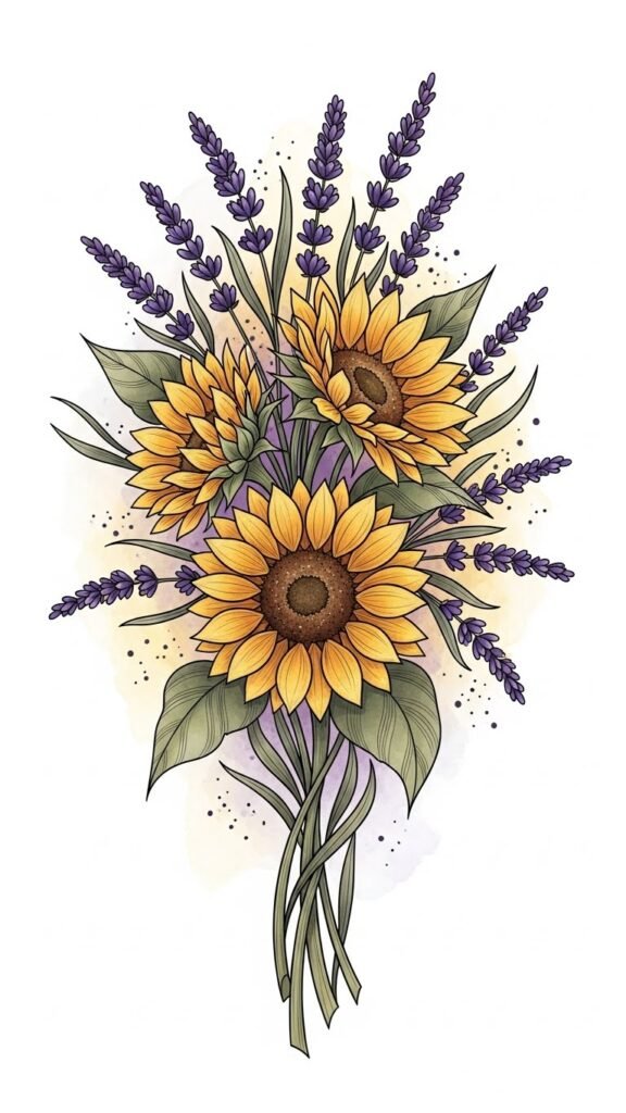 Let vibrant sunflowers transform your style instantly! The design pairs sunflowers and lavender to balance warmth and calm, evoking optimism and inner peace; emotion focuses on uplift and gentle resilience.