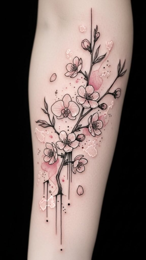The design emphasizes renewal and transience through falling petals and soft watercolor tones, evoking gentle melancholy and hopeful resilience; place it along the forearm for visibility and flow, the shoulder for graceful movement, or the ribcage for a more intimate, personal reminder.