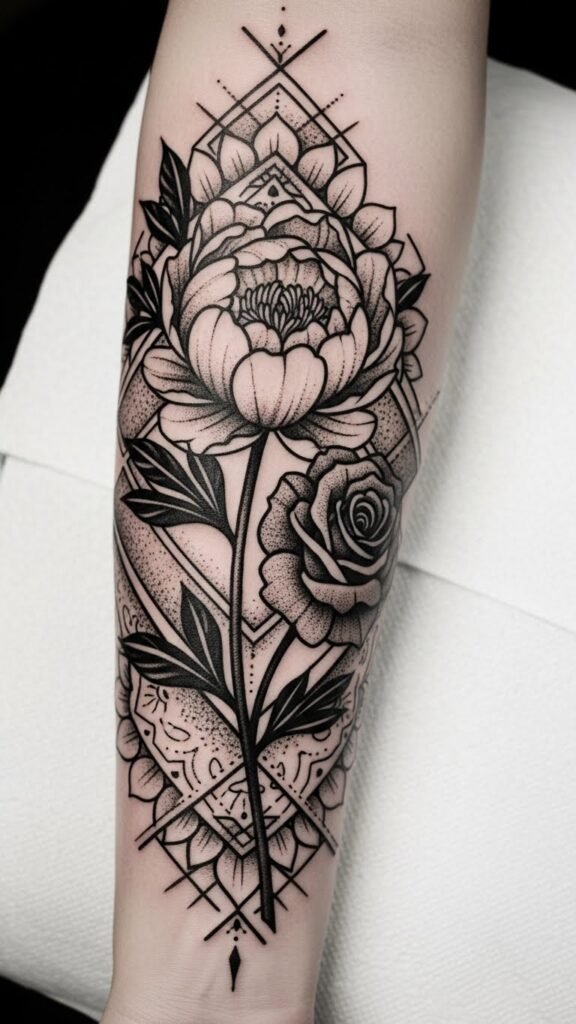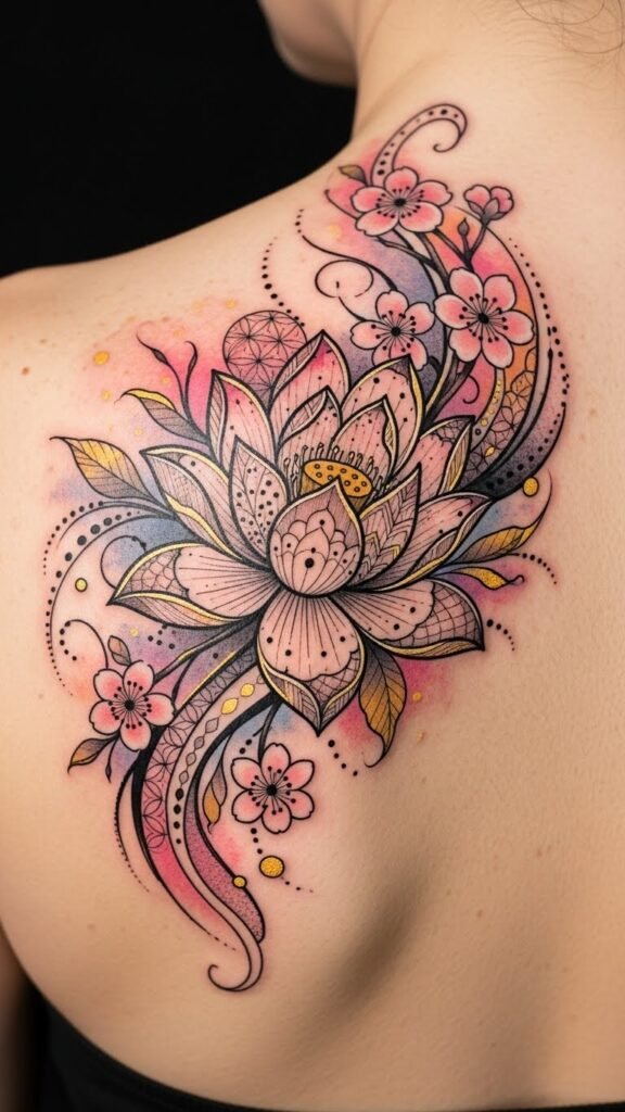 Placed on the upper back flowing toward the shoulder blade, it feels intimate yet visible, allowing movement to animate petals and the geometric accents to anchor the composition with quiet strength.