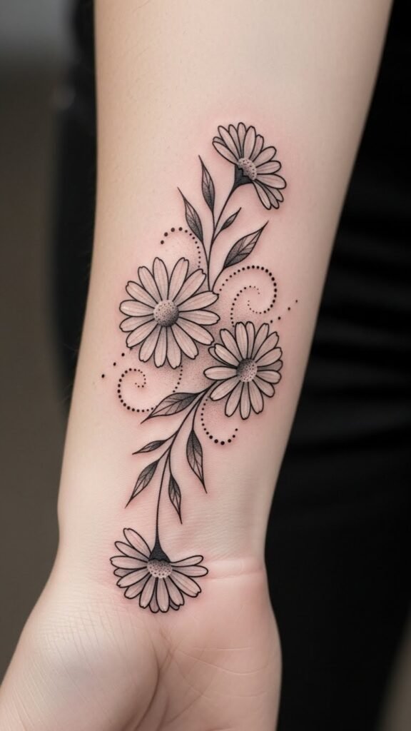 As the daisy chain winds along the wrist or circles the ankle, the design reinforces themes of purity, innocence, and personal freedom; the fine vines suggest connection and growth while the minimal shading and negative space keep the overall feeling light and unburdened.