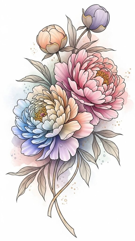With peony colors ranging from soft pastels to vibrant hues, you can express your unique spirit. Adorning your skin with peony tattoos will release your inner freedom and amplify your style effortlessly. The design centers on the peony as a symbol of love, wealth, and feminine strength; soft pastels evoke tenderness and memory, while vibrant hues convey passion and confidence.