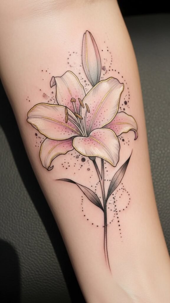 This lily design conveys purity, renewal, and refined beauty, evoking serene and uplifting emotions; ideal placement is the inner forearm for visibility and intimacy, the shoulder blade for a graceful sweep, or the ribcage for a private, personal statement.