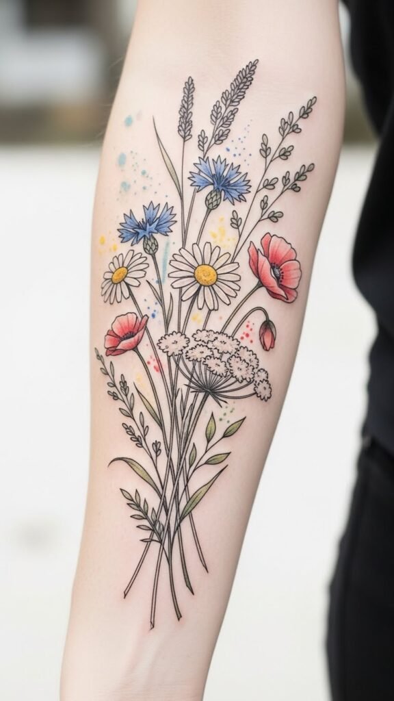 This design symbolizes resilience, free spirit, and natural beauty—watercolor hints convey emotion and warmth while fine-line details keep it intimate; placement along the forearm or calf allows the bouquet to follow the body’s natural lines, visible enough to express individuality yet adaptable for concealment if desired.
