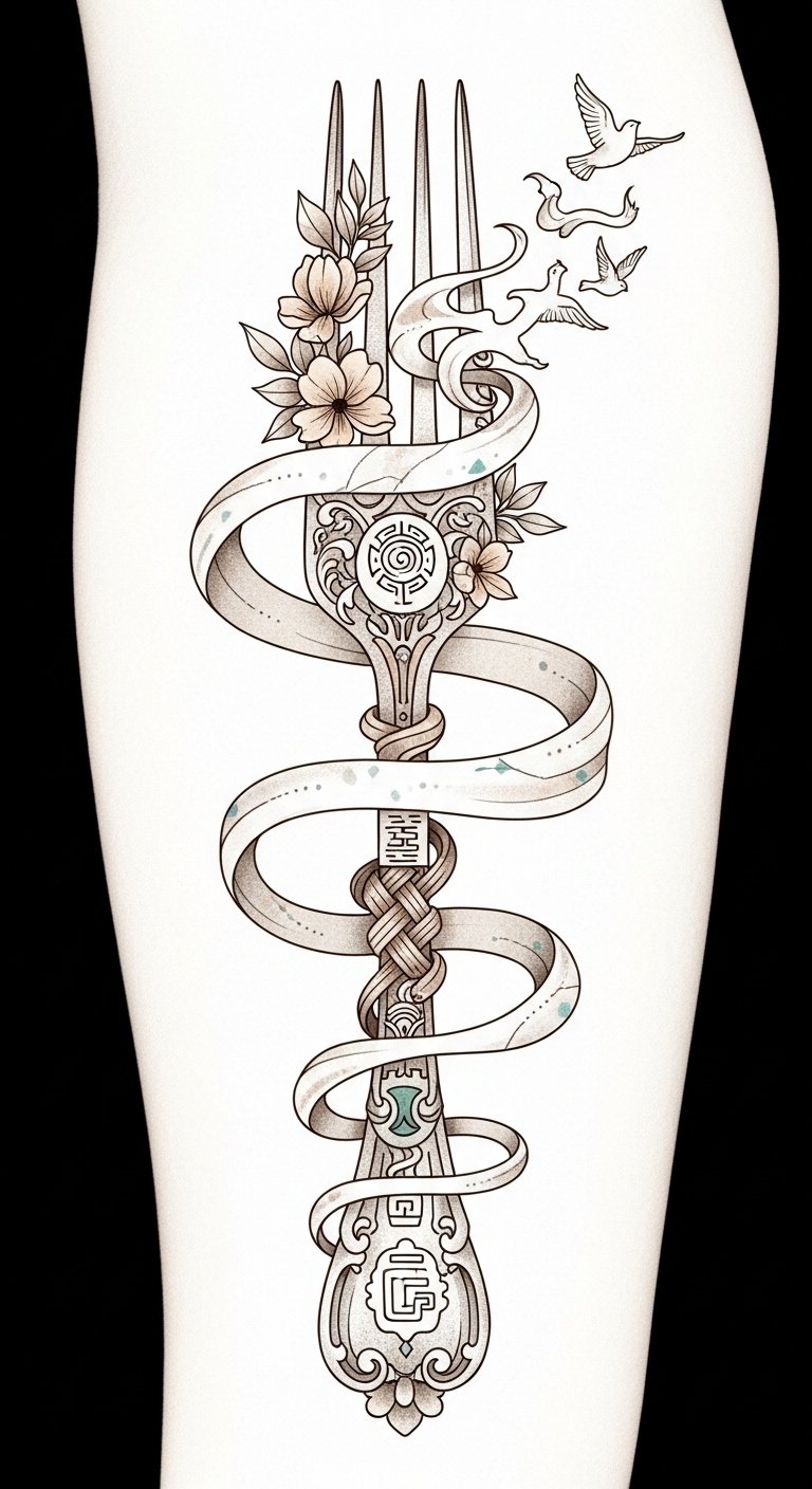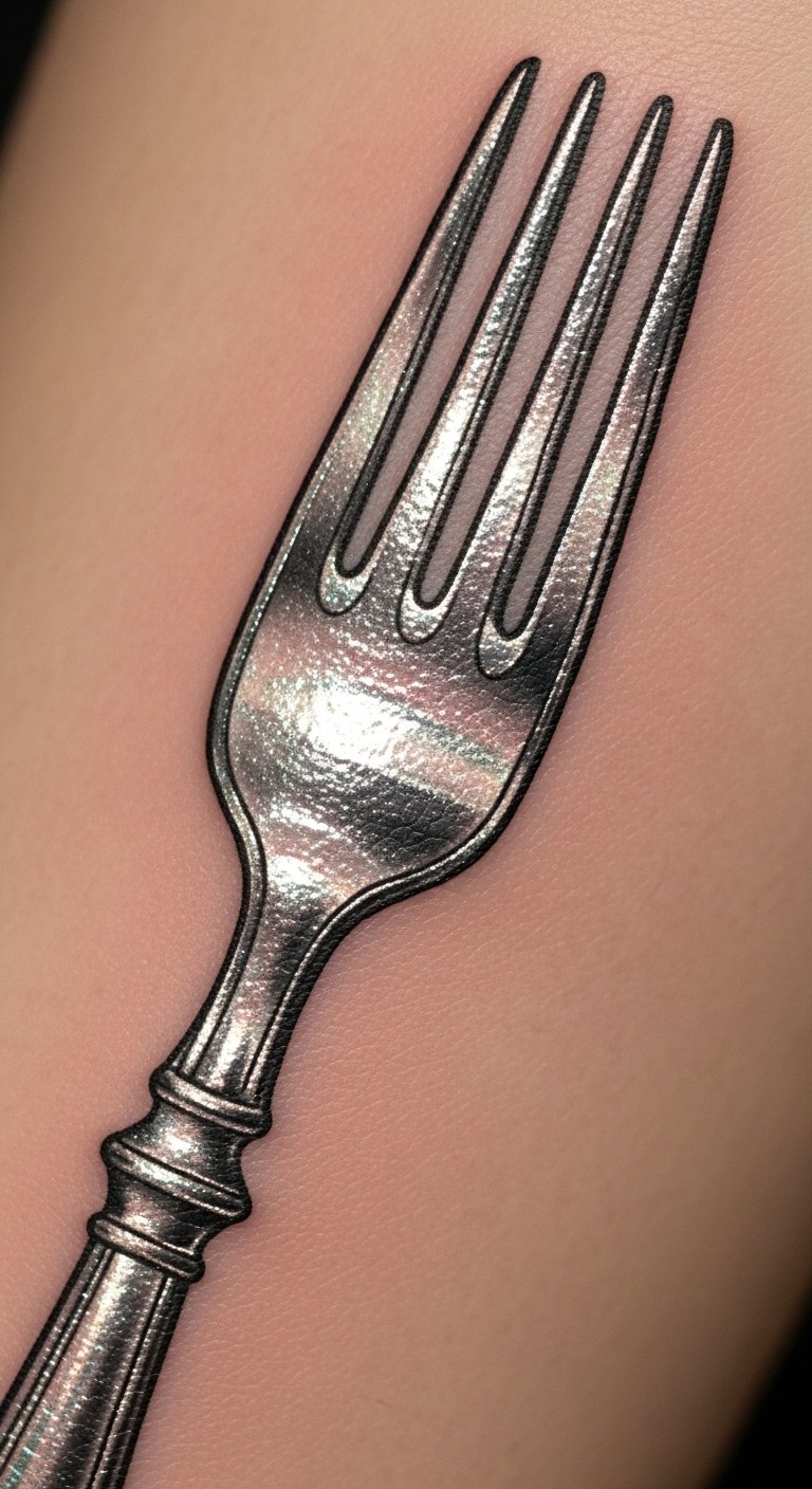 This concept pairs delicate, reflective metallic ink with fine-line detailing to evoke movement and light; place along the forearm or ribcage where the fork’s curve follows the body’s natural lines, suggesting personal nourishment and continuous transformation.