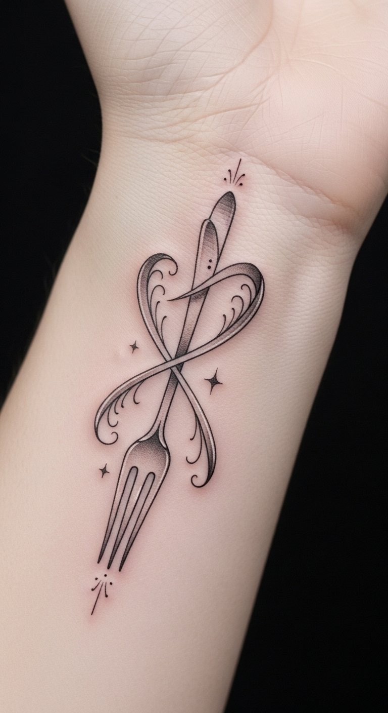 The design emphasizes warmth and intimacy—the intertwined utensils suggesting unity and shared meals—best placed on the inner forearm, wrist, or near the heart for daily visibility and emotional resonance.