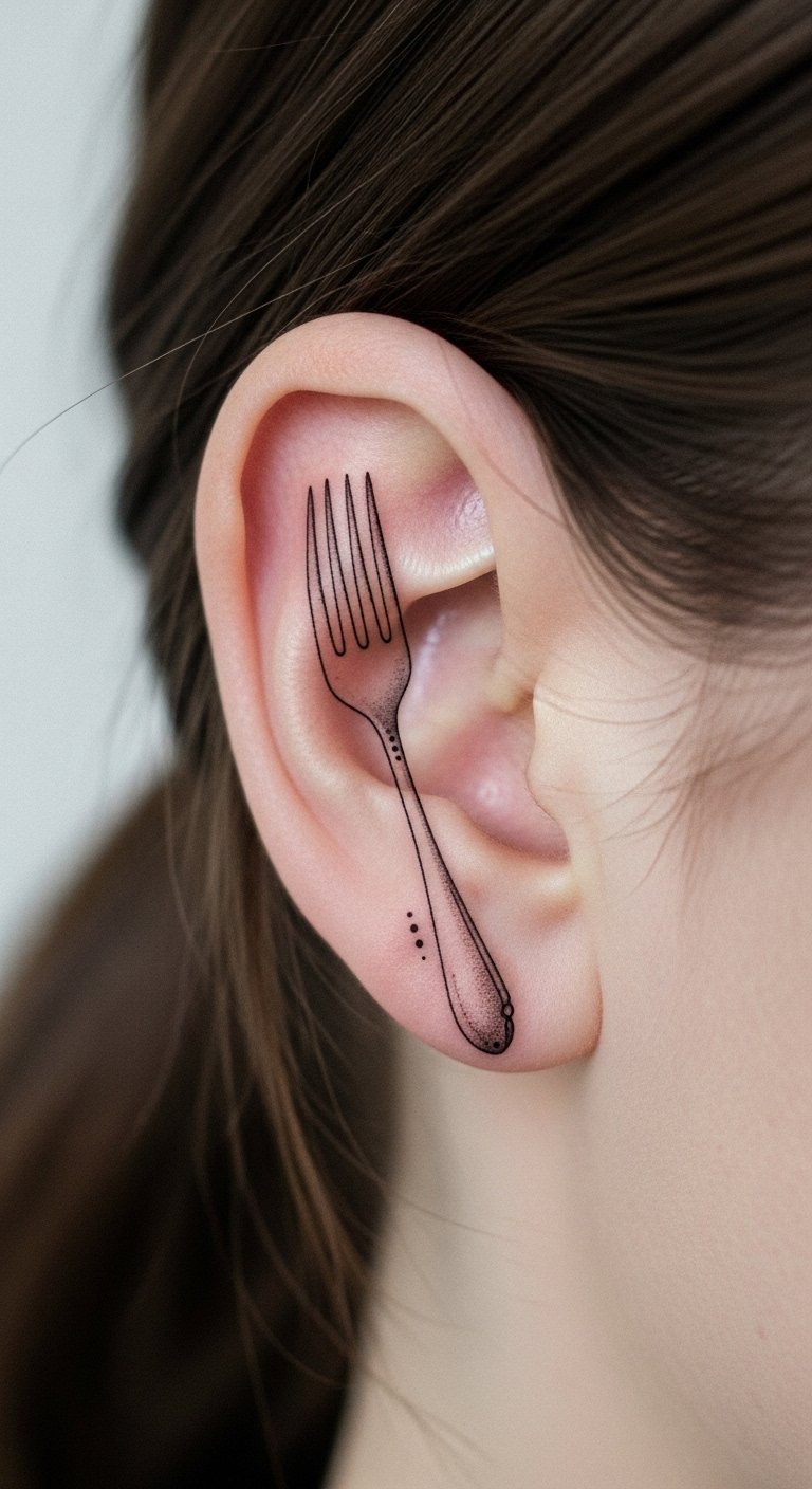 Embracing the art of subtlety, a delicate fork tattoo behind the ear transforms a simple culinary symbol into a personal statement of elegance and whimsy.