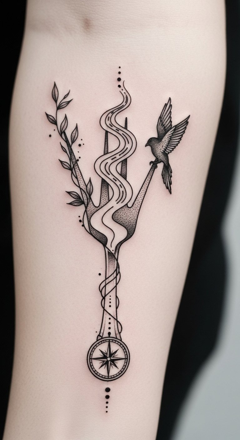 With each twist and turn, your fork tattoo becomes a vibrant reminder of your strength and transformation, celebrating the freedom to evolve. The design’s floral engravings and watercolor splashes convey gentle renewal and emotional warmth, the spiral and dotted motion line suggest ongoing personal evolution, and the gold flecks add sparks of hope.