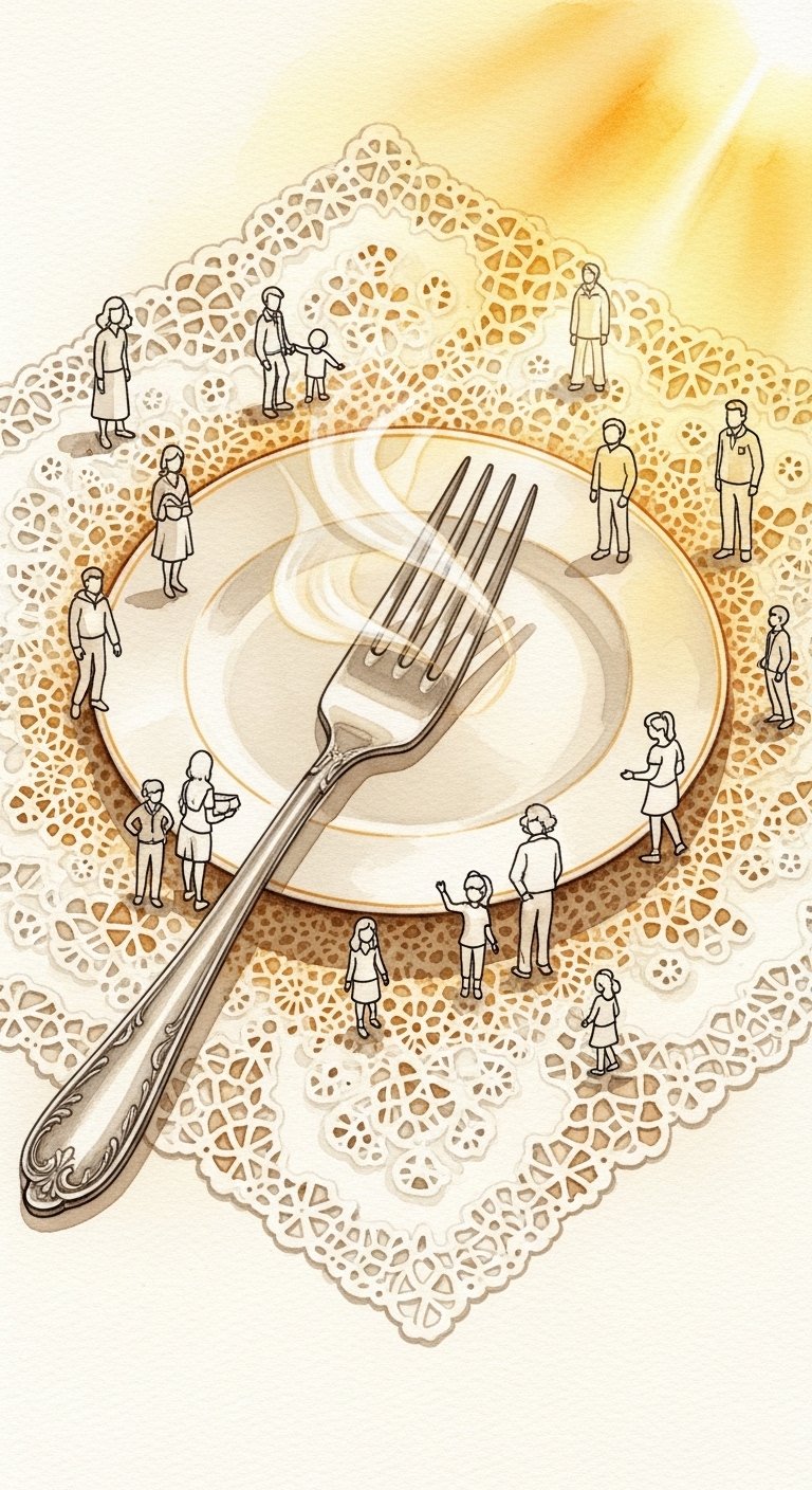 Each time you glance at your tattoo, you’ll feel a rush of nostalgia, celebrating the bonds that make life extraordinary and free. This placement works well on the inner forearm or over the heart where daily visibility reinforces connection; the fork represents nourishment and routine, the plate and silhouettes denote communal gathering, and the warm watercolor tones evoke comfort and fond memory.