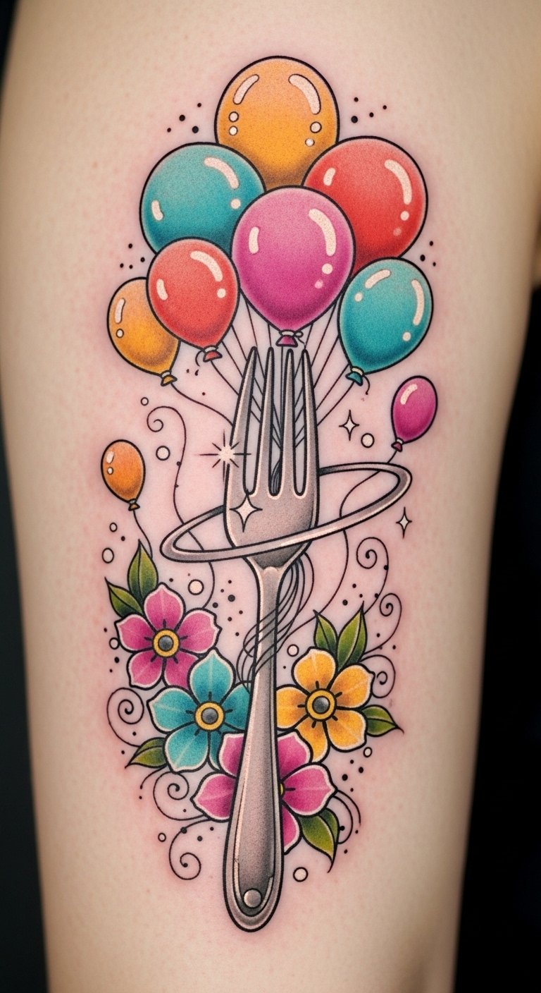 This design symbolizes lightheartedness, spontaneity, and a celebration of everyday pleasures; the fork’s motion and bright palette convey joy and movement, balloons suggest uplift and freedom, and flowers add growth and tenderness.