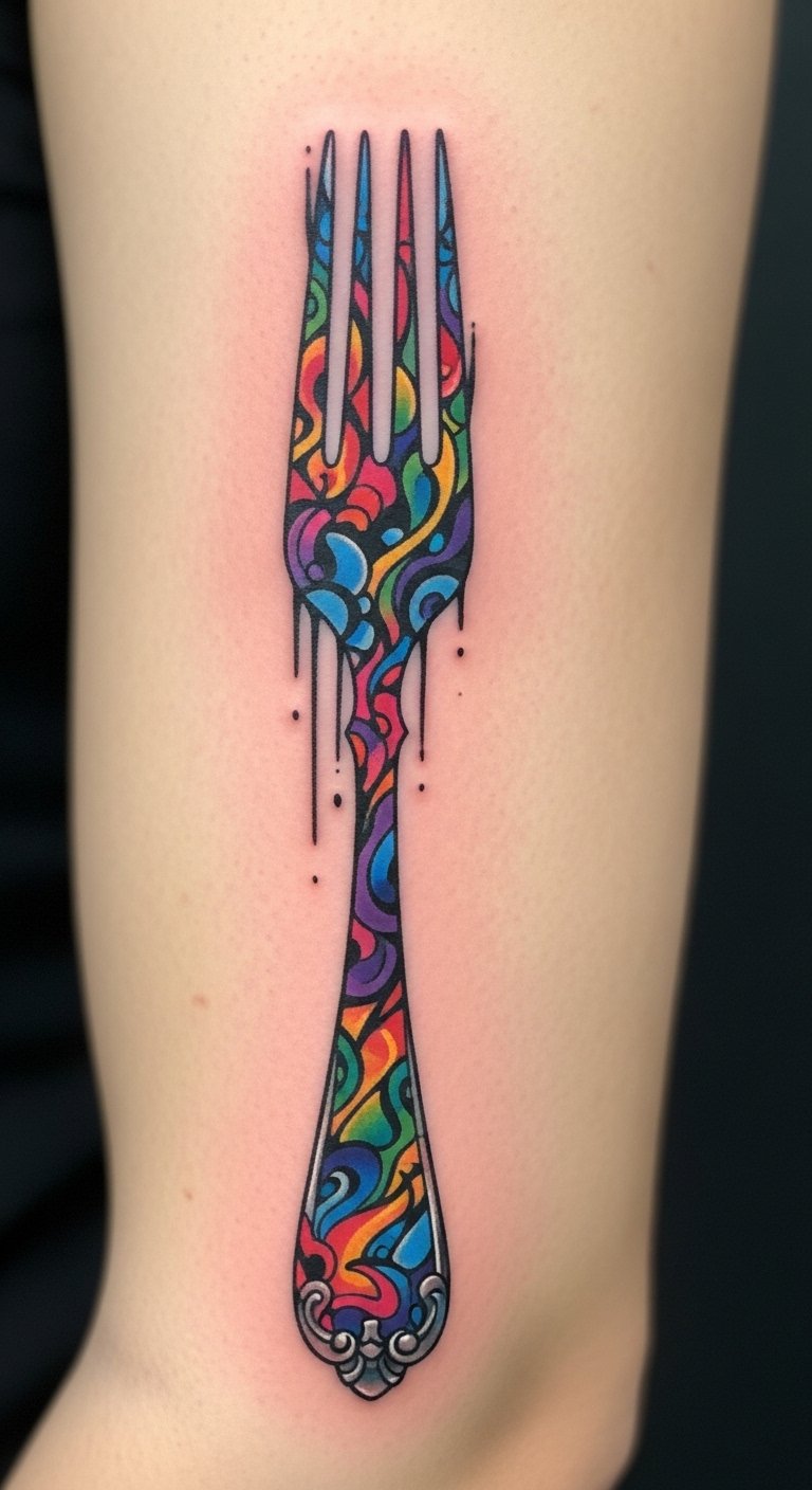 What if your fork tattoo could be a canvas for vibrant self-expression? Imagine colorful forks adorned with abstract art styles, each hue telling a story of freedom and creativity. These designs embody colorful fork symbolism, transforming a simple utensil into a masterpiece. Let your skin become a gallery, showcasing your unique journey and passion for life’s flavors through stunning, artistic expression.