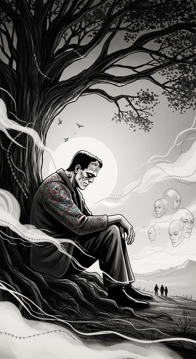 Rendered in high-contrast black and gray with subtle green undertones, the design centers the creature’s flat head and bolts within a fractured oval frame, threads of barbed wire and blossoming nightshade weaving around him; sparks of electricity trace delicate filigree that transitions into script-like wind lending movement toward the shoulder or forearm. Symbolically this piece balances creation and exile—sharp lines of rejection softened by floral elements that speak to resilience and individuality, evoking melancholy and defiant freedom; placement on the upper arm or sternum allows for visibility and intimacy, matching the tattoo’s themes of identity and acceptance.