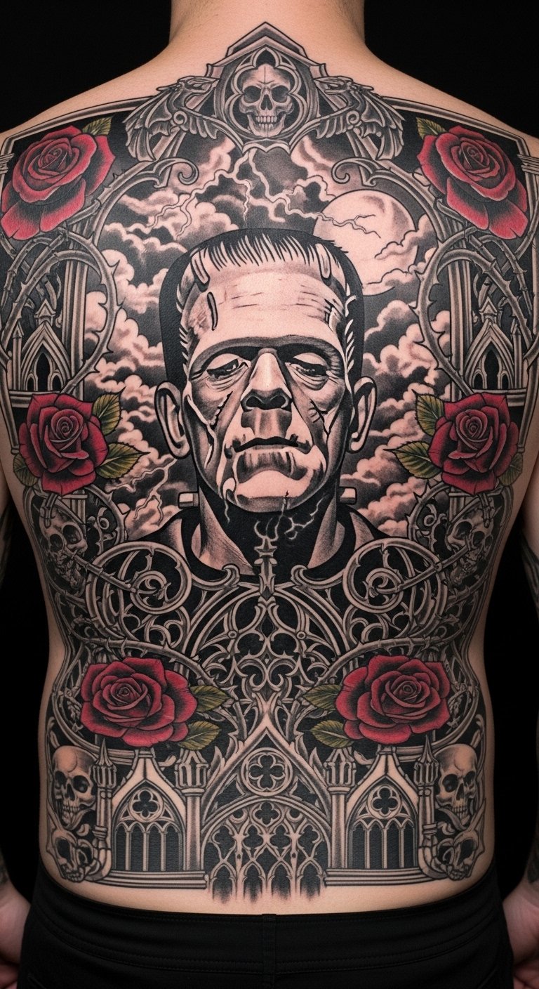 This concept places the composition centered on the spine, with Frankenstein’s monster rendered in a painterly, scarred realism at the upper center, surrounded by intertwining gothic filigree, thorned roses, and subtle anatomical sketches fading toward the lower back.