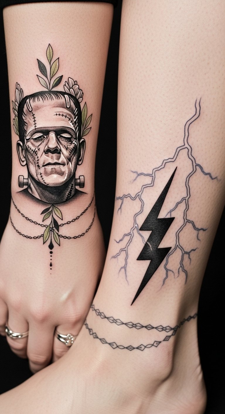 Whether you choose intricate wrist designs showcasing Frankenstein’s monster or bold ankle placements featuring lightning bolts, these tattoos capture your unique spirit.