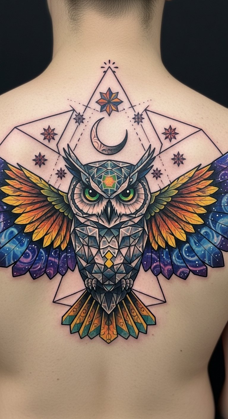 This design channels the original lines into a visual: a symmetrical geometric owl rendered with interlocking polygons and fine linework, crescent moon and stars woven into the wings, jewel-tone gradients (deep indigo, teal, gold) highlighting eyes that glow with inner light. Symbolically it emphasizes wisdom, mystery, intuition, and nocturnal insight; emotionally it evokes calm confidence, protective solitude, and a quiet, powerful freedom. Ideal placements are the upper back or chest for a central, guardian presence, the forearm or calf for visible personal talismans, and the ribcage for a more intimate, contemplative connection.