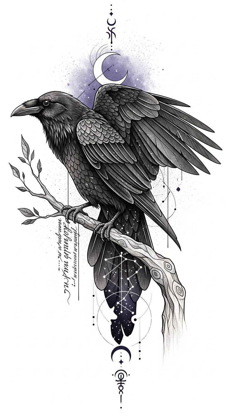 This design emphasizes introspection and quiet power: the raven as guardian of transitions, the moon and constellations representing guidance and destiny, and the sigils suggesting hidden knowledge.