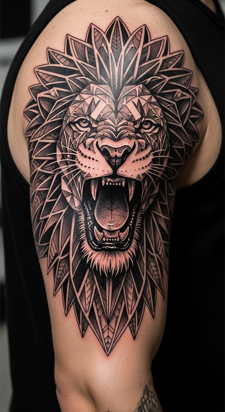 This design concept centers on a geometric lion head rendered with interlocking polygons and fine dotwork, combining sharp facets for the mane and smooth, layered geometry for the face to convey both power and precision; place along the upper chest or back for a bold, regally centered statement, or scale to the forearm for a more personal emblem.