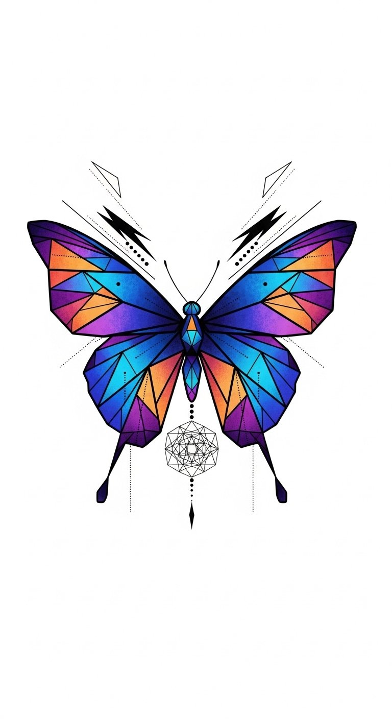 With each line and angle, you express your spirit, embracing the elegance of life’s journey. Placement on the forearm or upper back allows the angular wings to follow muscle lines, evoking movement and personal metamorphosis; the color interplay and negative space balance boldness with introspective serenity, symbolizing liberation, resilience, and joyful renewal.