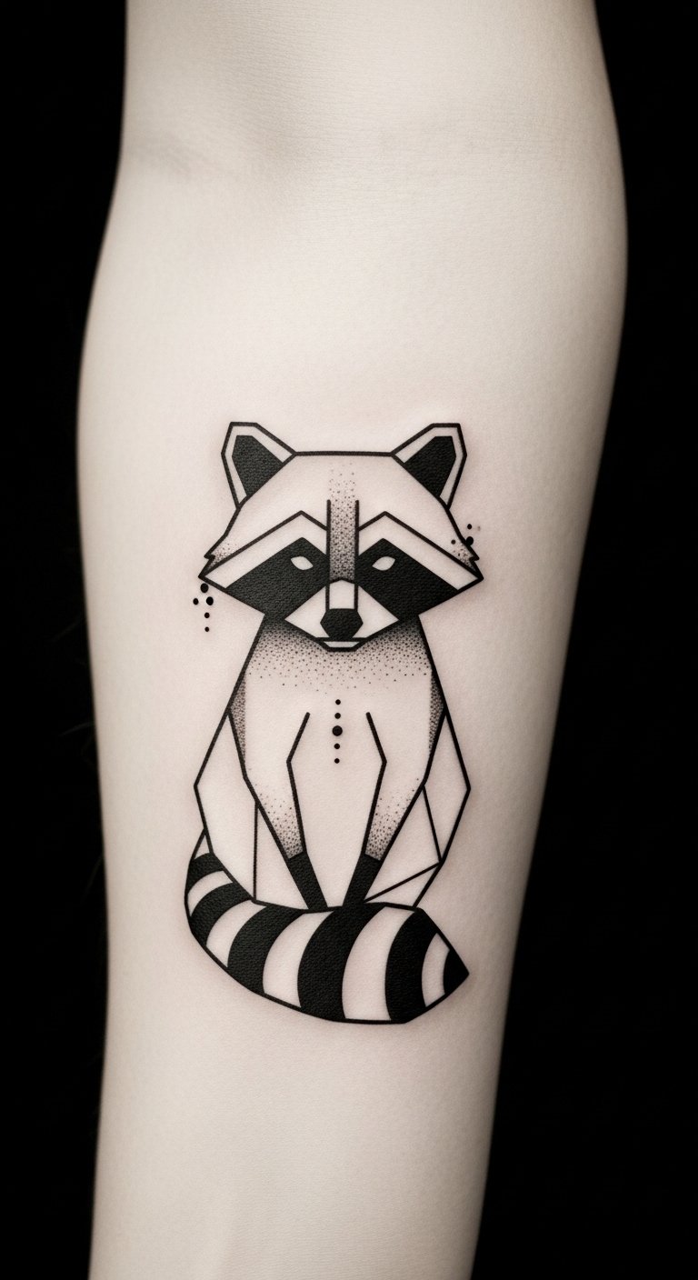 Embodying curiosity and cleverness, a minimalist geometric raccoon tattoo offers a playful yet sophisticated nod to this enchanting creature. With its clean lines and sharp angles, this design captures the essence of freedom and individuality.