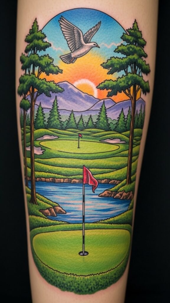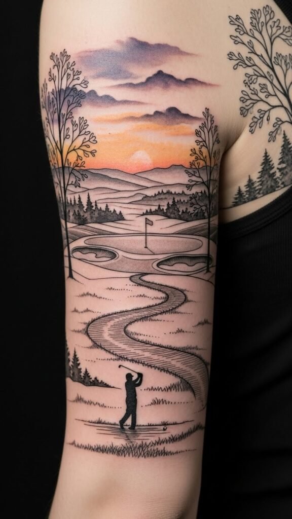 Ideal placements include the forearm or shoulder blade for visibility and flow, the ribcage for a more intimate keepsake, or along the calf where the elongated fairway and sunset gradients can wrap naturally.