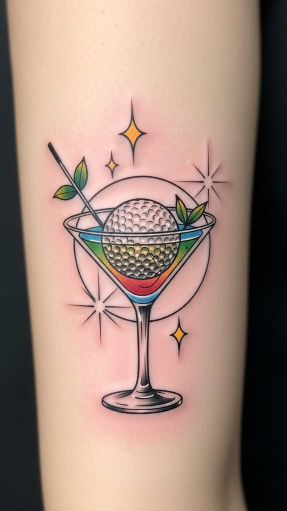 This design symbolizes the playful union of sport and celebration, evoking lightheartedness, confidence, and a taste for life’s finer moments; it suits wrists, forearms, or ankles for visibility during social outings, or the chest/upper arm for a more personal statement, and can be rendered in bright, tongue-in-cheek color for a bold mood or in simple black-line minimalism for a subtle, elegant emotional tone.