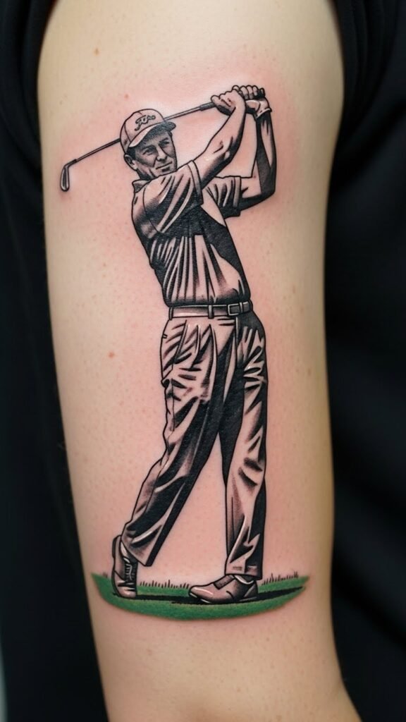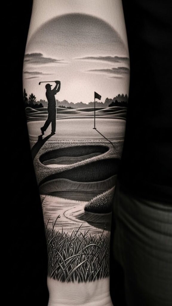A black and grey golf scene tattoo captures the tranquil beauty and intensity of the game in a striking visual narrative. This design showcases the golf tattoo significance, using black-grey contrast to highlight intricate elements like rolling fairways or sunset silhouettes.