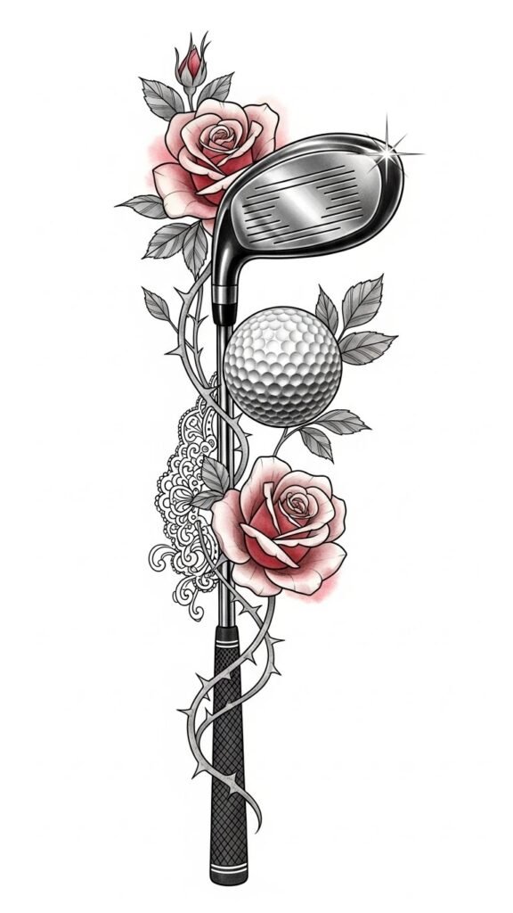 The rose symbolism adds a layer of depth, representing love and commitment, while floral aesthetics enhance your tattoo’s visual appeal. This fusion perfectly captures your devotion to golf and the beauty of life intertwined.