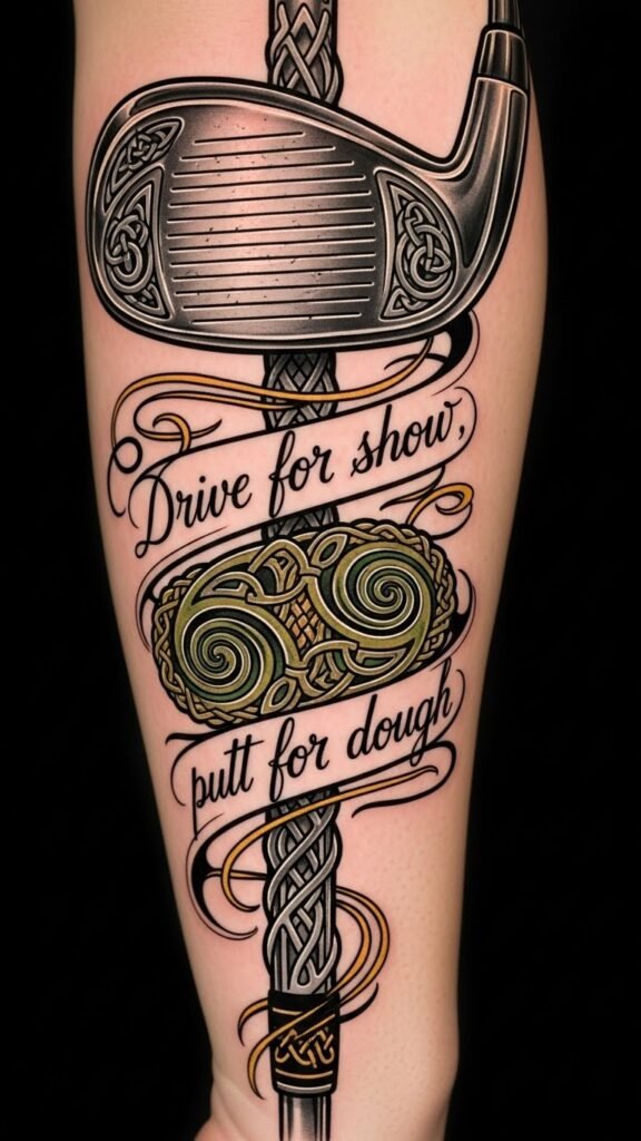 The design symbolizes skill, tradition, and continuity—Celtic knots for unbroken lineage, the club for dedication, and the script for personal credo. Emotionally it conveys pride and reverence; place along the forearm or calf where the wraparound knotwork follows the limb’s contours for a dynamic, wearable narrative.