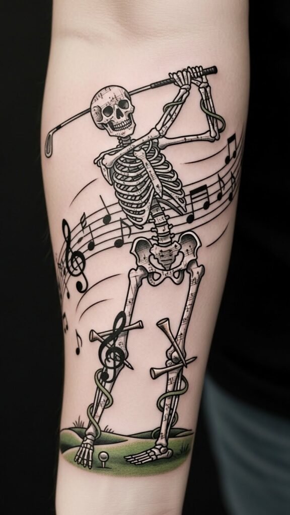 A golf skeleton adorned with musical notes captures the rhythm and golf, blending playful designs with skeleton symbolism.