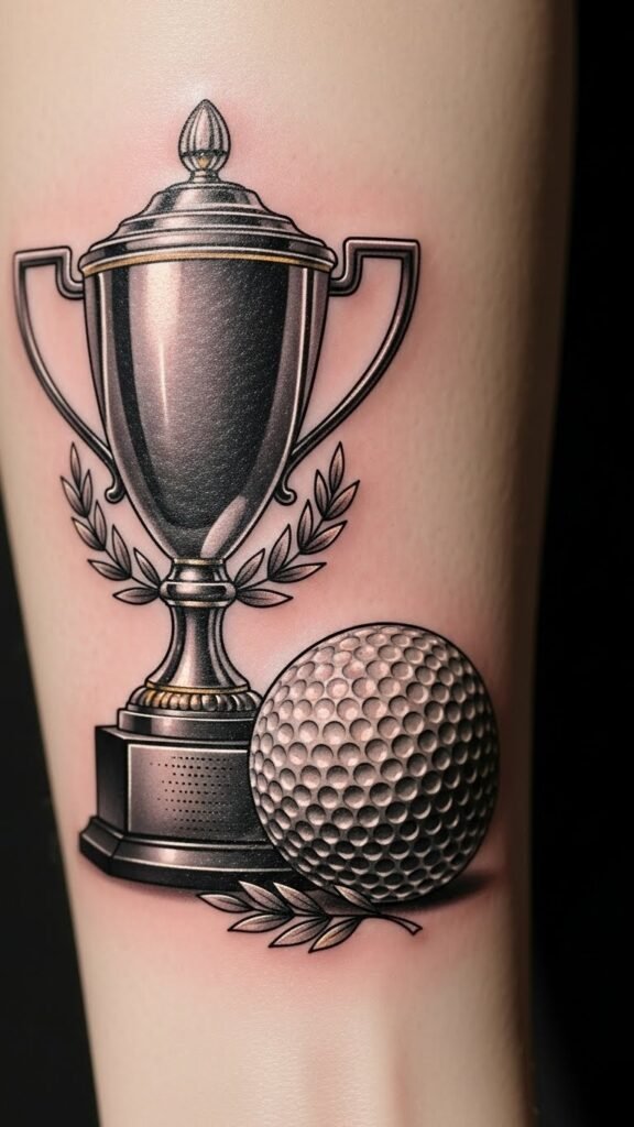 As you step onto the green, the thrill of competition stirs within you, sparking dreams of championship glory. A tattoo featuring a shimmering trophy beside a perfectly detailed golf ball captures your championship memories, symbolizing your relentless pursuit.