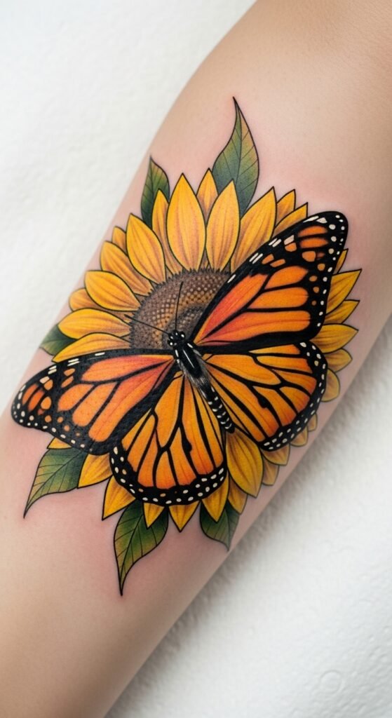 Monarch symbolism embodies transformation, while the sunflower’s meanings reflect adoration and loyalty.