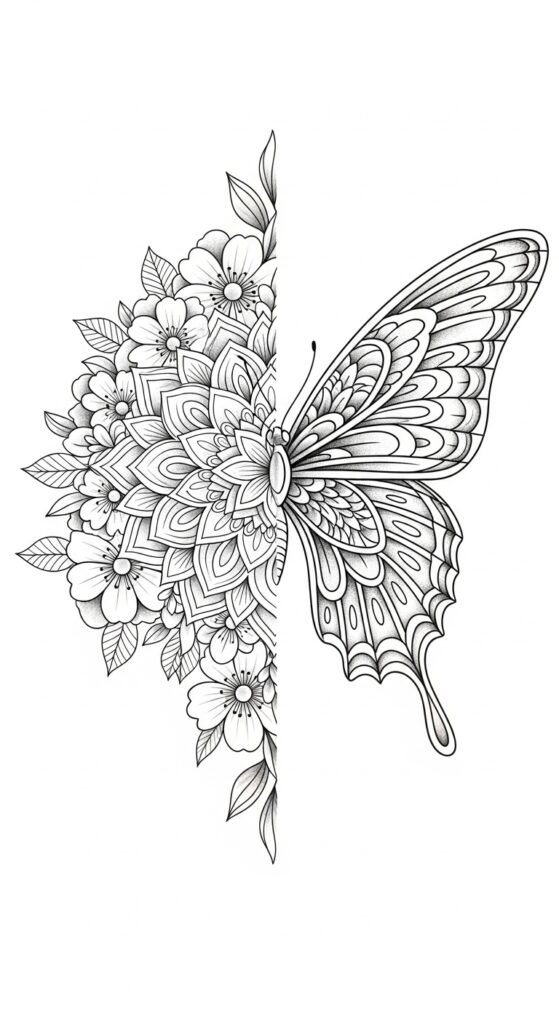 Building on the enchanting imagery of butterflies and blossoms, the half butterfly and floral mandala tattoo design offers a mesmerizing blend of nature and spirituality. This unique piece embodies mandala symbolism, representing harmony and transformation. The intricate floral patterns intertwine with the butterfly’s delicate wings, creating a stunning visual that speaks to your personal journey and desire for freedom. Embrace this enthralling design as your next ink adventure!