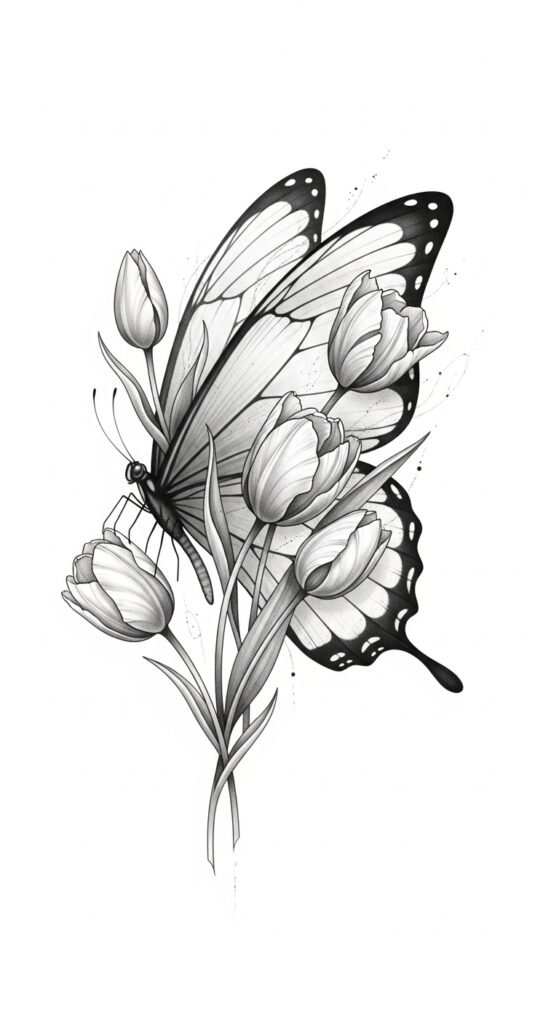 This tattoo concept conveys transformation and renewal through the fusion of butterfly and tulip imagery; the luminous gradients and dew droplets evoke vulnerability and hope while the fine linework and filigree veins add delicate intricacy for emotional depth.