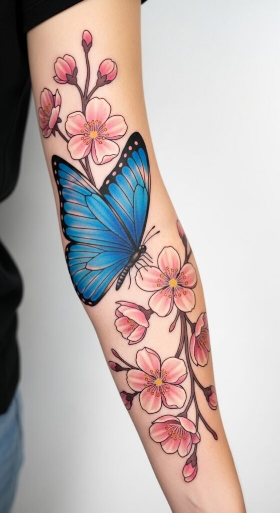 As a tattoo concept, this composition blends fine-line realism for the butterfly with soft watercolor washes for the cherry blossoms. The blue butterfly sits slightly angled on a thin branch that arcs along the collarbone, shoulder blade, or outer forearm, with petals drifting to suggest movement and temporality.