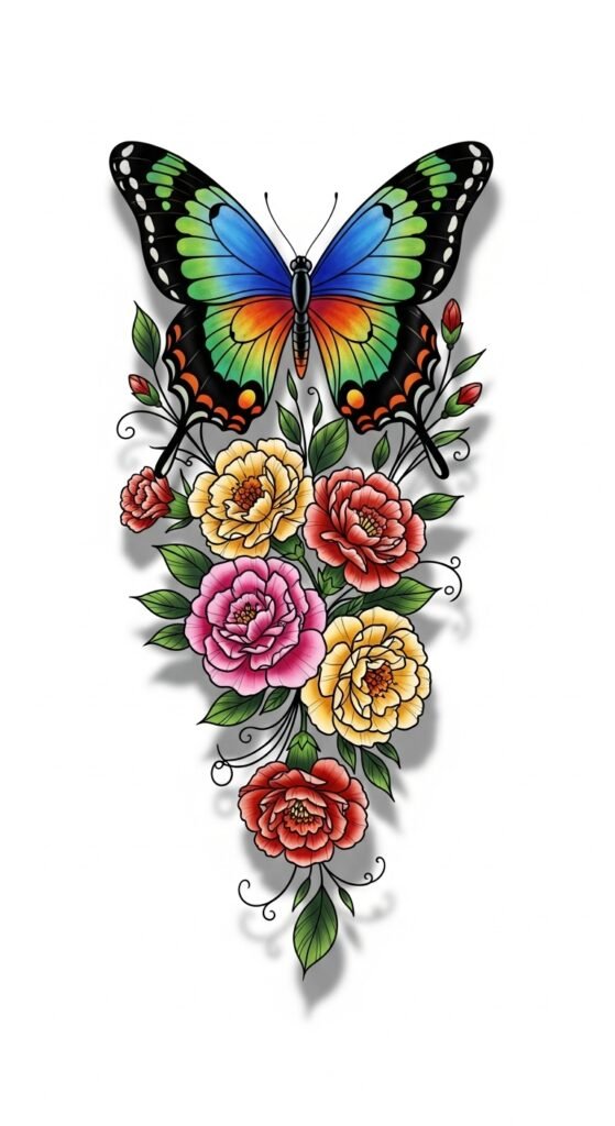 Embracing the vibrant energy of life, a colorful butterfly entwined with a carnation arrangement creates an enchanting tattoo design that celebrates both beauty and resilience.
