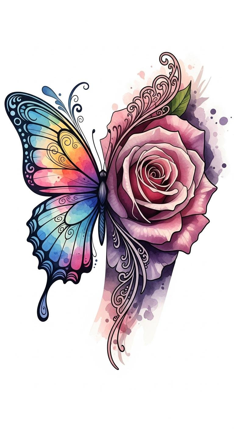 This stunning design embodies blooming symbolism, capturing the essence of transformation and beauty. The elegant fusion of delicate butterfly wings and lush rose petals reflects your personal journey, intertwining growth and resilience, inviting freedom to flourish in every intricate detail and vivid color.